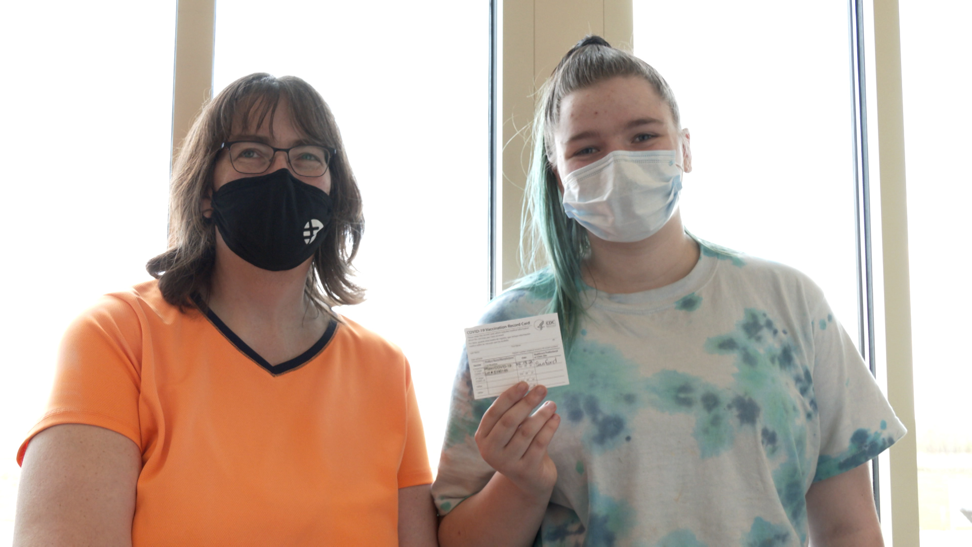 MaKenzie Holte (right) with her mom, Jennifer Holte, after MaKenzie’s COVID-19 vaccination May 13, 2021. (Jason Anschutz, Sanford Health)